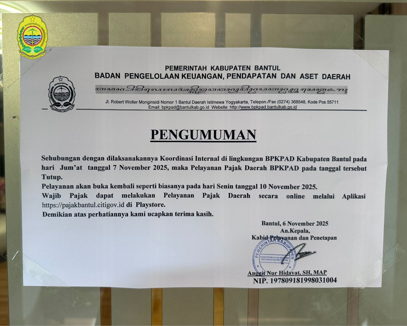 Sehubungan dengan dilaksanakannya kegiatan Koordinasi Internal di lingkungan BPKPAD Kabupaten Bantul Pada Hari Jum'at tanggal 7 November 2025 , maka Pelayanan Pajak Daerah BPKPAD pada tanggal tersebut Tutup.