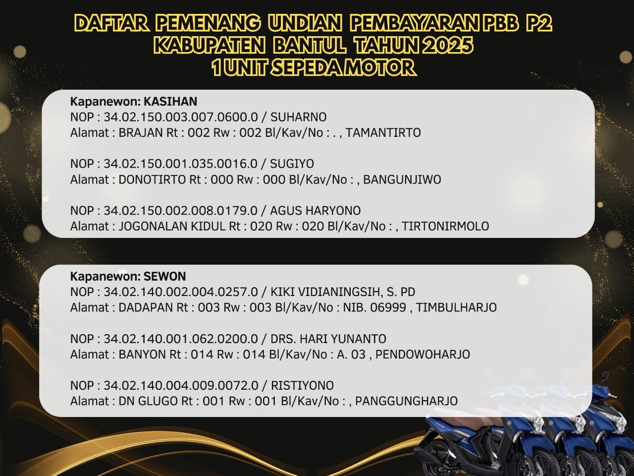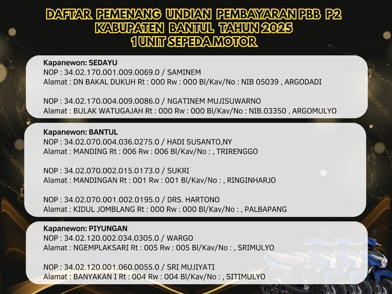 Pengundian Pemenang Pembayaran PBB-P2 Kabupaten Bantul untuk Tahun Pajak 2025 berlangsung di Candi Tirto Raharjo pada hari Jum'at 14 November 2025, Pemenang undian pembayaran PBB P2 diundi oleh Wakil Bupati Bantul, Sekretaris Daerah Kab. Bantul dan Kepala BPKPAD Bantul. Pengundian tersebut disaksikan oleh perwakilan dari Dinas Sosial DIY, Notaris dan Polres Bantul.