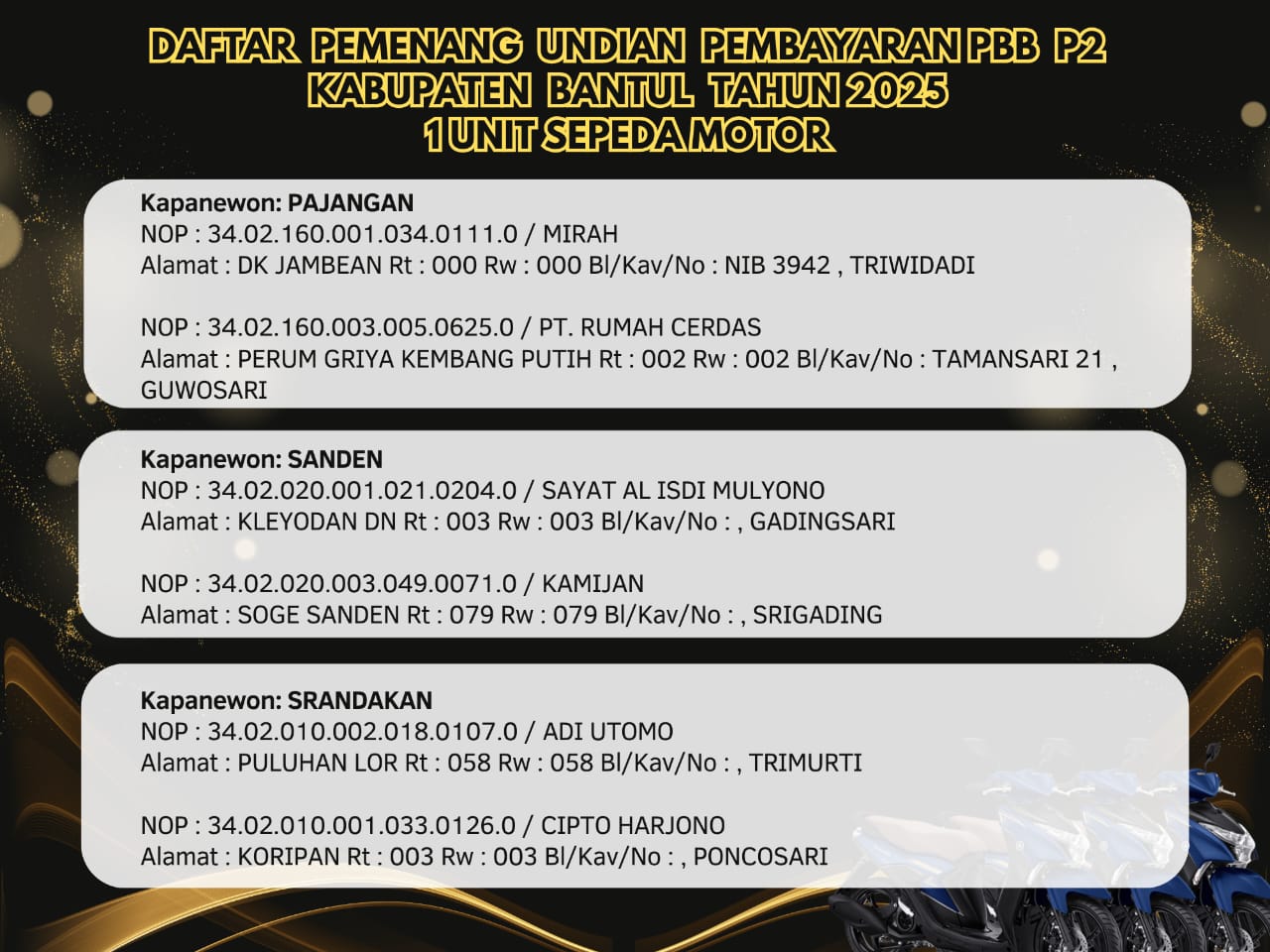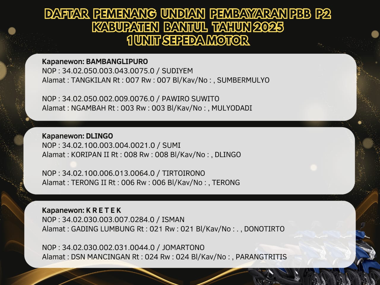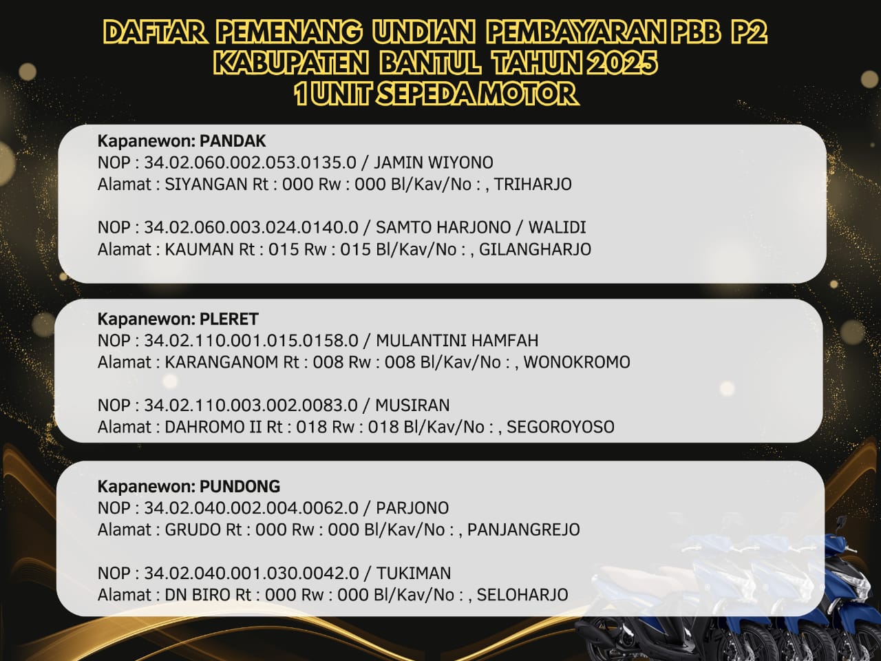 Peserta undian adalah wajib pajak PBB P-2 yang melakukan pembayaran ketetapan pajak tahun 2025 sebagai berikut: