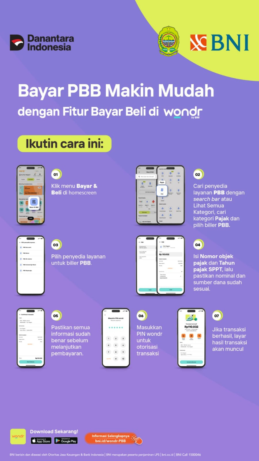 Pembayaran PBB P2 Kabupaten Bantul kini bisa dilakukan melalui Channel Pembayaran Bank BNI. Wajib Pajak dapat memanfaatkan seluruh channel pembayaran yang dimiliki Bank BNI, antara lain: Aplikasi Wondr, ATM, dan Teller / Agen Bank BNI.